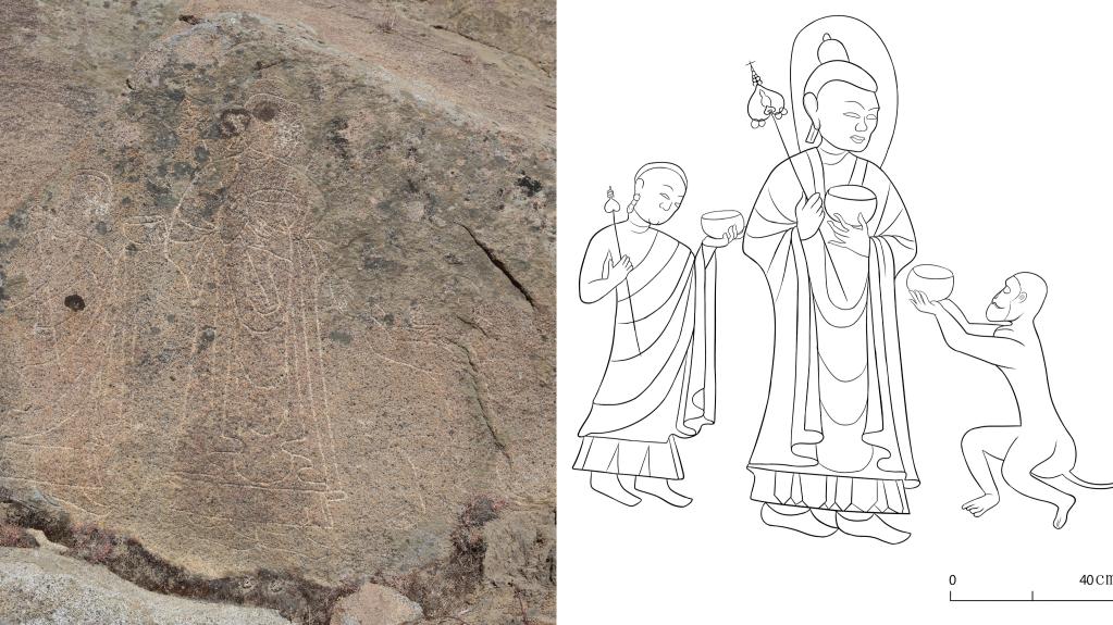 據(jù)悉,2017年,拉薩市柳梧新區(qū)嘎瓊寺駐寺干部永中久美根據(jù)當?shù)卮迕裉峁┑木€索,在拉薩市東面蔡公堂的杰丁噶小山溝內(nèi)首次確認了這處早期摩崖石刻群。同年9月,杰丁噶摩崖石刻造像群被公布為第七批西藏自治區(qū)文物保護單位。資料圖片及正視線圖由西藏自治區(qū)文物保護研究所提供