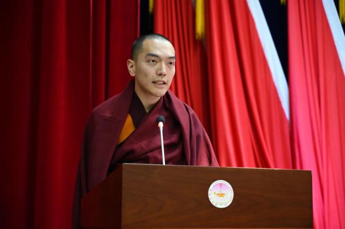 夏仲活佛在西藏佛學(xué)院一場活動上發(fā)言。記者 趙朗 攝