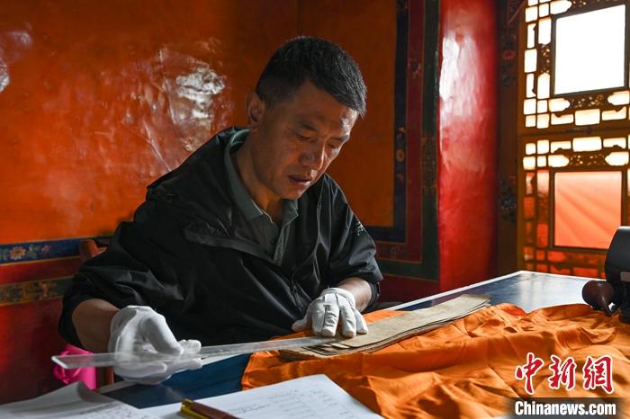 圖為6月27日,拉薩,西藏自治區(qū)藏醫(yī)院文獻(xiàn)研究所相關(guān)負(fù)責(zé)人次旦平措對(duì)交接而來的古籍檢查測量尺寸。 中新社記者 趙朗 攝