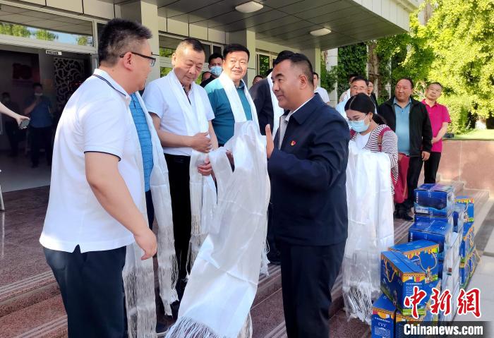 圖為日土縣縣長達(dá)瓦次仁為考察團(tuán)一行獻(xiàn)哈達(dá)。日土縣縣委供圖