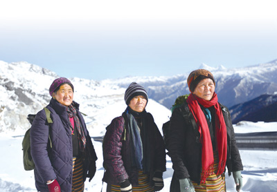 次仁曲珍(左)、普赤(中)、達(dá)吉走在前往哨所的路上。 新華社記者 覺 果攝