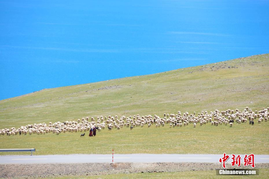 羌塘草原位于西藏自治區(qū)北部,平均海拔超過4600米,進入夏季后,羌塘草原上的雨水多起來了,水草也更加豐茂了。這里湖泊星羅棋布,還有浩瀚的草原和冰川、溫泉。野牦牛、藏羚羊、藏原羚、藏野驢等珍稀野生動物與雪山、草地、藍天、白云,構(gòu)成撼人心魄的壯美畫面。圖為西藏那曲市班戈縣牧民在湖邊放羊。 貢嘎來松 攝