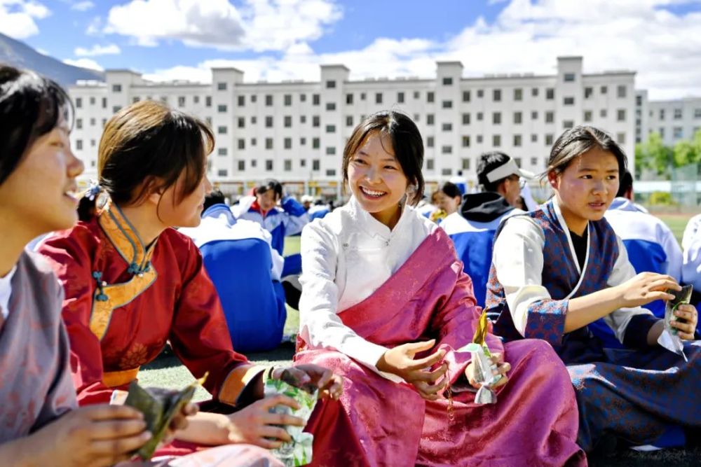 西藏山南市第二高級中學的學生品嘗安徽省援藏干部和企業(yè)家代表贈送的粽子(2022年6月3日攝) 張汝鋒 攝