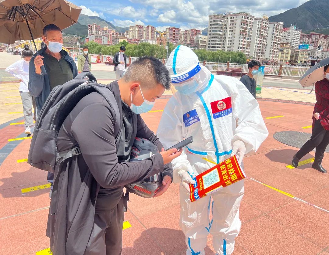 “為了您的安全,請保持1米以上間隔,謝謝?!蓖砩?點多,在茶馬廣場,支隊三級消防士張興梁,依然堅守在抗疫一線,維持著排隊做核酸的長隊。從早上7點開始,張興梁和其他消防隊員已堅守了14個多小時?!拔鞑貢円箿夭钐卮?,白天防護服里面衣服都濕透了,但是到晚上這個點已經(jīng)干了,正好不用換衣服了?!睆埮d梁打趣的說到。