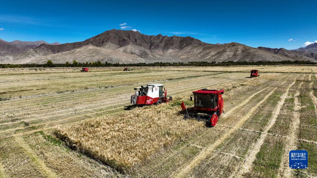 西藏日喀則市江孜縣熱索鄉(xiāng)努康村農(nóng)機(jī)合作社的村民集中對(duì)村里三千多畝耕地進(jìn)行機(jī)械化收割(9月19日攝)。新華社記者 晉美多吉 攝