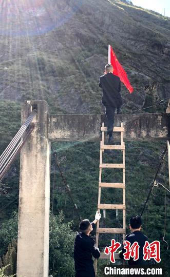 巡邏間隙,移民管理警察攻國杰在口岸遺址上方更換國旗?!」陆y(tǒng) 攝