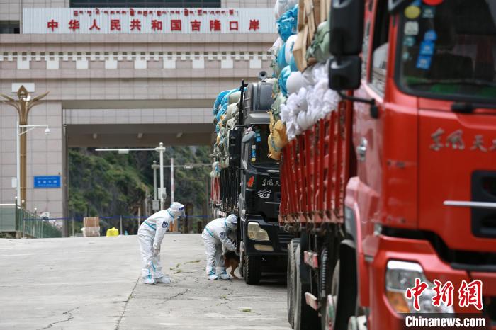 吉隆出入境邊防檢查站移民管理警察對外出口岸限定區(qū)域車輛進行消毒?!⌒じ毁F 攝
