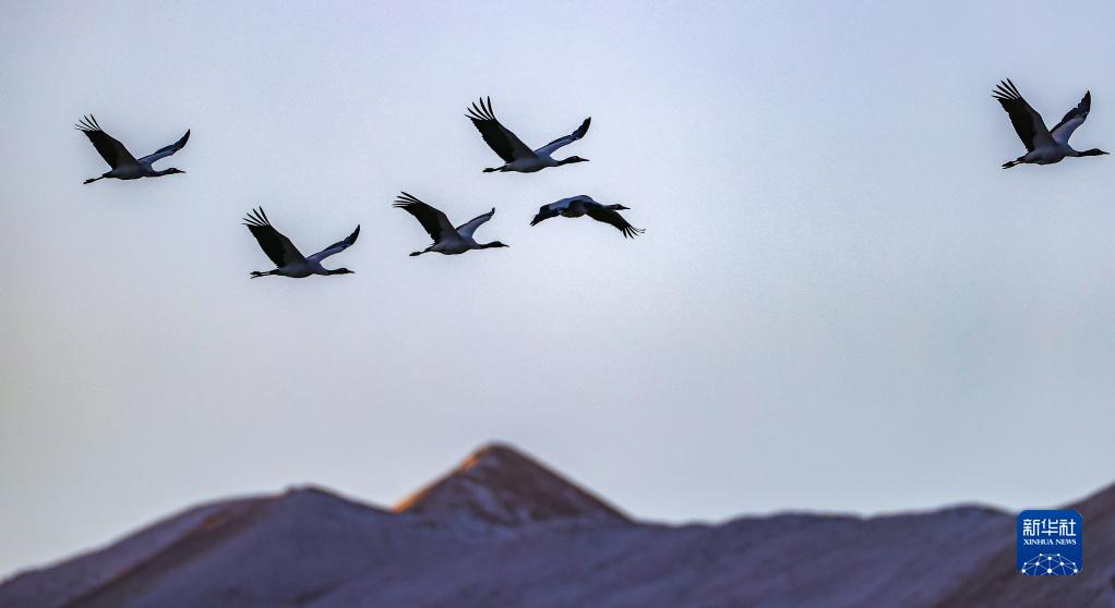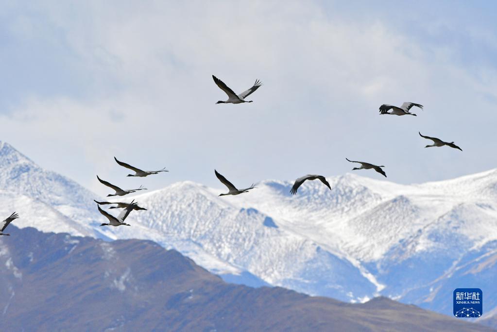 黑頸鶴在林周縣強嘎鄉(xiāng)上空飛翔(11月6日攝)。新華社記者 周荻瀟 攝