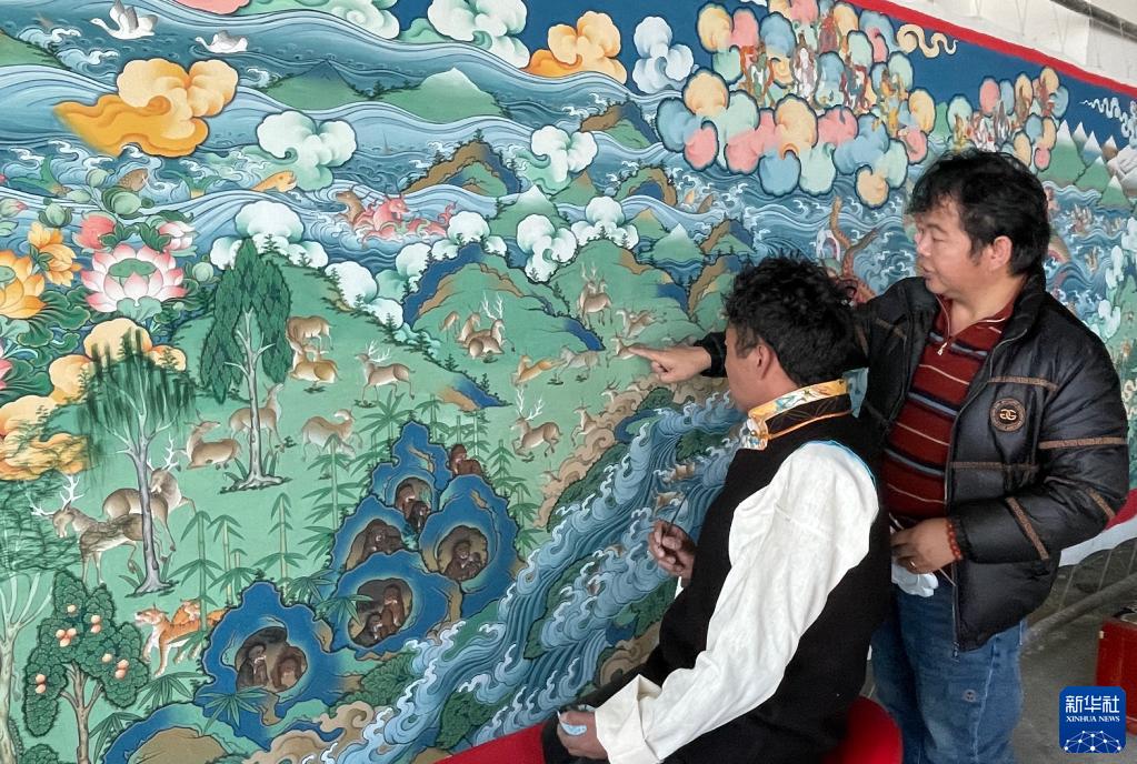 西藏勉薩畫派非遺傳承人西落(右)正在和他的學生繪制新題材唐卡“百匠唐卡·千米畫卷”(12月19日攝)。新華社發(fā)