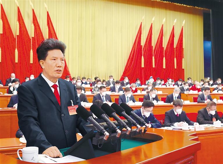 1月14日上午,自治區(qū)第十二屆人民代表大會第一次會議舉行第二次全體會議。洛桑江村向大會作自治區(qū)人大常委會工作報(bào)告。 記者 唐斌 攝
