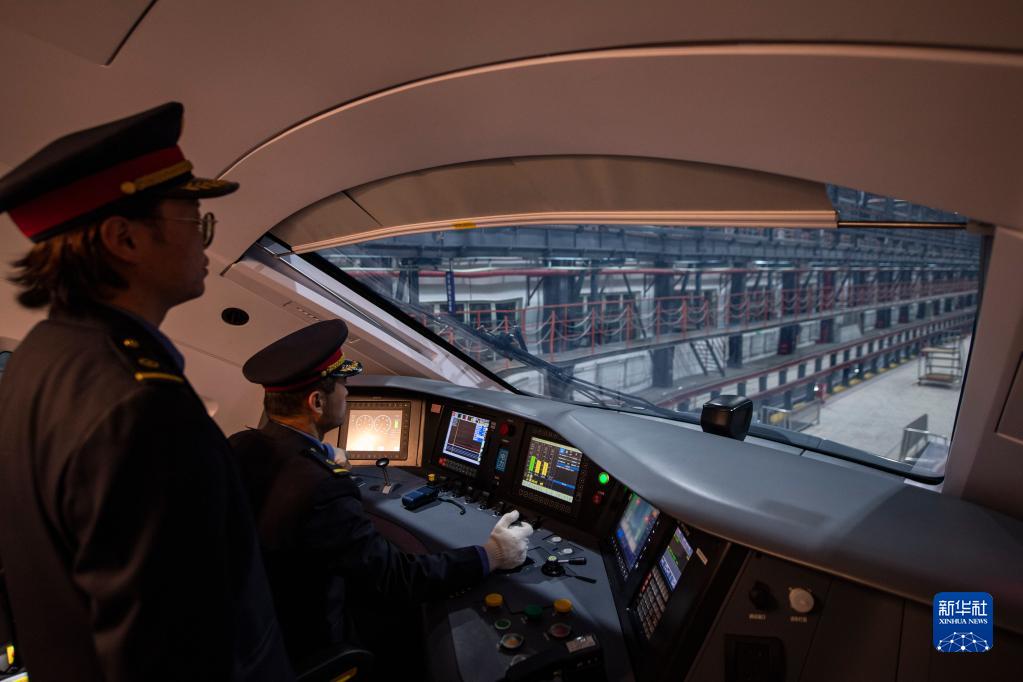 在拉薩機(jī)輛整備中心,黃起崗(右)和同事將動(dòng)車組駛?cè)胪\囄恢茫?月11日攝)。新華社記者 孫非 攝