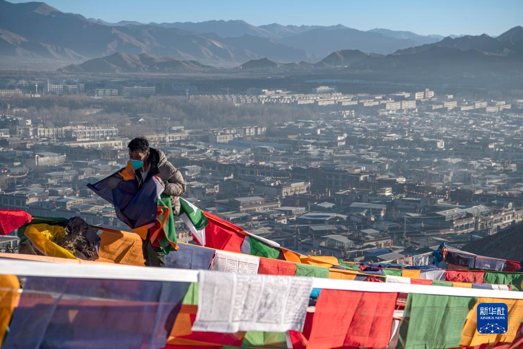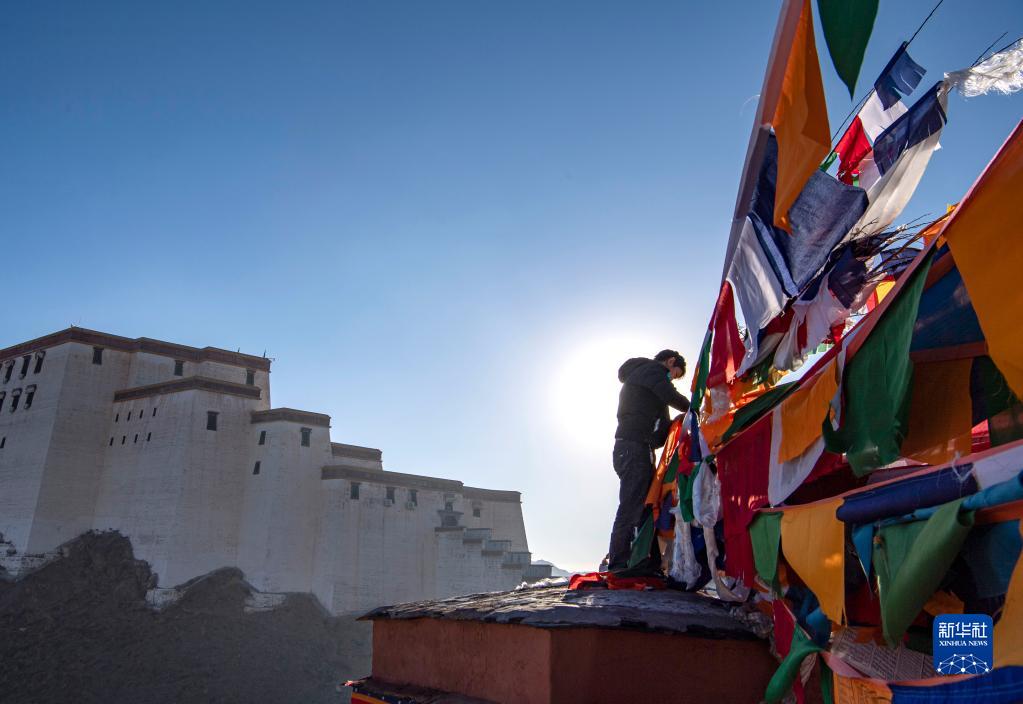1月24日,日喀則市桑珠孜區(qū)的藏族群眾在懸掛五彩經(jīng)幡。新華社記者 晉美多吉 攝