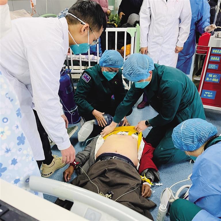 急診科值班醫(yī)生陳勝、副護(hù)士長趙文熠等立即攜搶救車、除顫儀趕赴現(xiàn)場,此時,冬某意識喪失、頸動脈搏動消失、呼吸極其微弱。見患者病情危及生命,醫(yī)護(hù)人員立即實施搶救工作。急診醫(yī)護(hù)團(tuán)隊配合默契,胸外心臟按壓、球囊輔助通氣、建立靜脈通道、靜推腎上腺素、查心電圖、監(jiān)測生命體征、吸痰……一切有條不紊地進(jìn)行著。隨后,心電圖提示室顫,醫(yī)護(hù)人員立即予以非同步200J電除顫1次,待轉(zhuǎn)運床到位后立即轉(zhuǎn)運患者至搶救室進(jìn)一步救治,轉(zhuǎn)運過程中心肺復(fù)蘇不間斷。