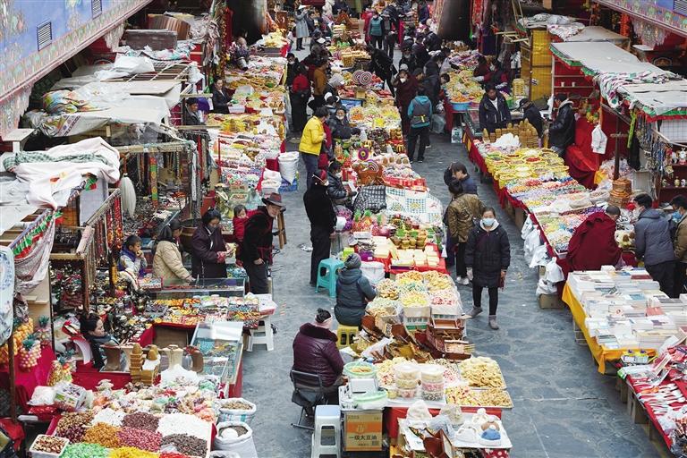 藏歷新年臨近,拉薩街頭置辦年貨的人群熙熙攘攘,大街小巷張燈結(jié)彩,古城街巷洋溢著濃濃的年味兒。八廓商城年貨會(huì)、沖賽康批發(fā)市場(chǎng)作為置辦年貨的首選地,從早到晚都是商賈云集、人聲鼎沸,一番熱鬧景象。