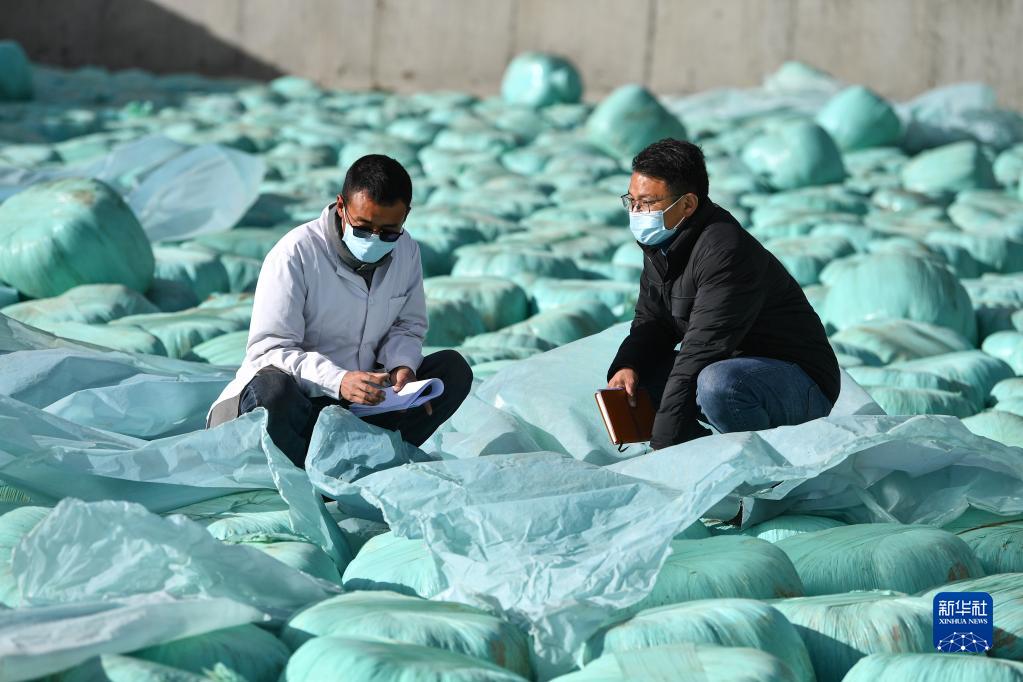 扎西江村(右)在隆子縣一家標(biāo)準(zhǔn)化奶牛養(yǎng)殖基地查看牛飼料,調(diào)研當(dāng)?shù)禺a(chǎn)業(yè)發(fā)展情況(2月14日攝)。新華社記者 晉美多吉 攝