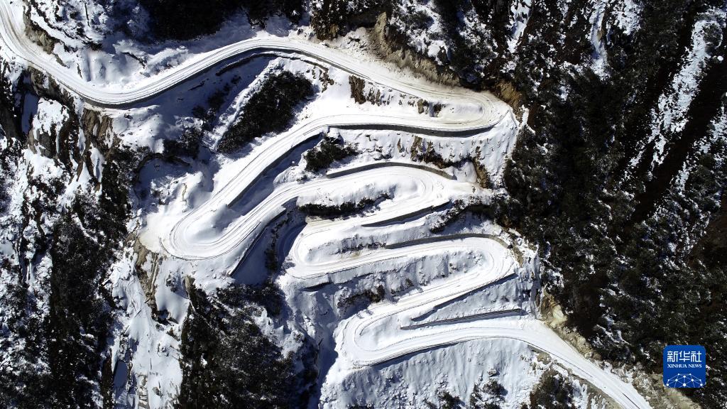 西藏洛扎縣境內(nèi)懸崖峭壁間的通村公路(2022年1月17日攝,無(wú)人機(jī)照片)。新華社記者韓曦樂 攝