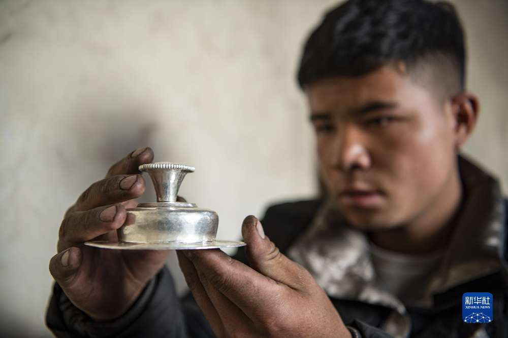 在扎西吉彩金銀銅器加工廠工人正在檢查打制的銀器坯子(3月9日攝)。新華社記者孫非 攝