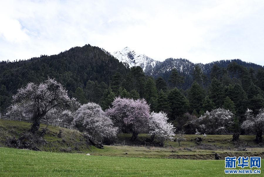 林芝市波密縣境內(nèi)桃花和雪山相互映襯(3月25日攝)。新華網(wǎng) 旦增努布 攝
