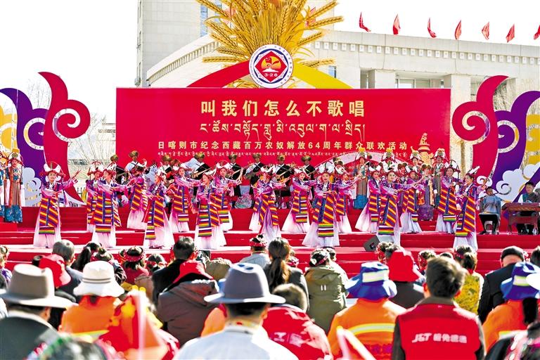 圖為為日喀則市紀(jì)念西藏百萬農(nóng)奴解放64周年群眾聯(lián)歡活動現(xiàn)場。