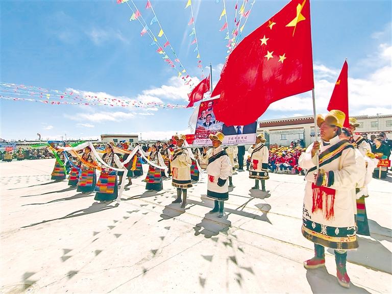 悠揚(yáng)的歌聲獻(xiàn)給黨,歌唱黨的英明領(lǐng)導(dǎo);歡快的舞蹈跳起來,跳出人民幸福生活。從珠峰腳下到年楚河畔,從高原牧場到山谷林地,處處升起面面五星紅旗,贊美共產(chǎn)黨的歌聲響徹天際,匯聚起強(qiáng)大動能。