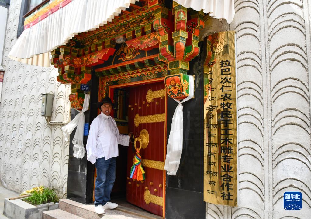 拉巴次仁在農(nóng)牧民手工木雕專業(yè)合作社門(mén)前(4月25日攝)。新華社記者 晉美多吉 攝