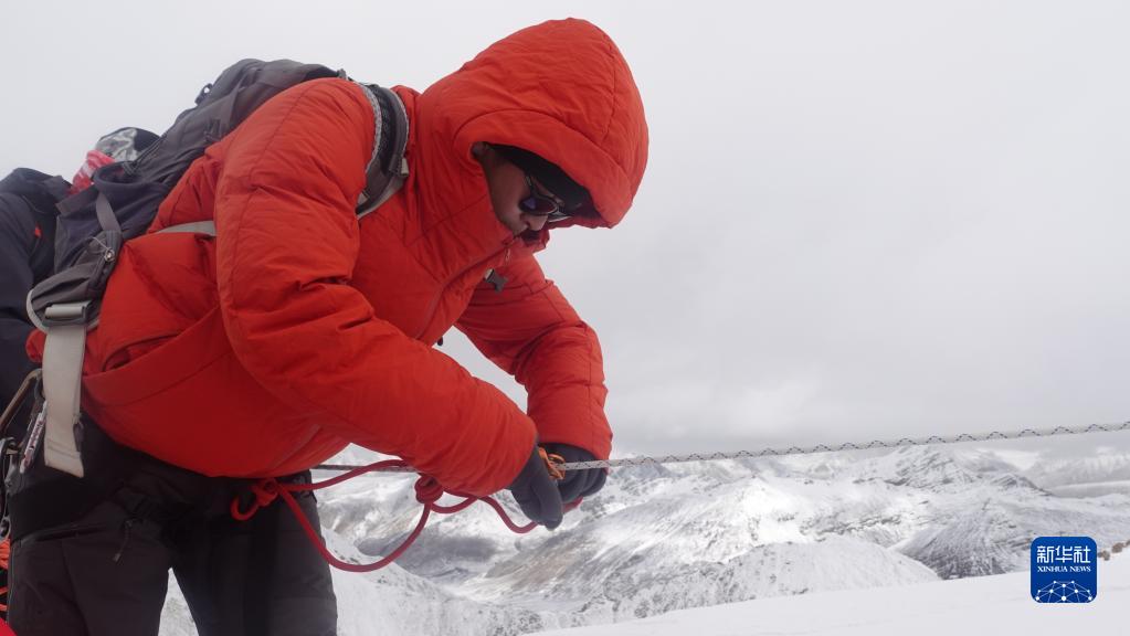5月3日,登山愛好者在海拔6010米的洛堆峰峰頂拍照留念。新華社記者 黃耀漫 攝