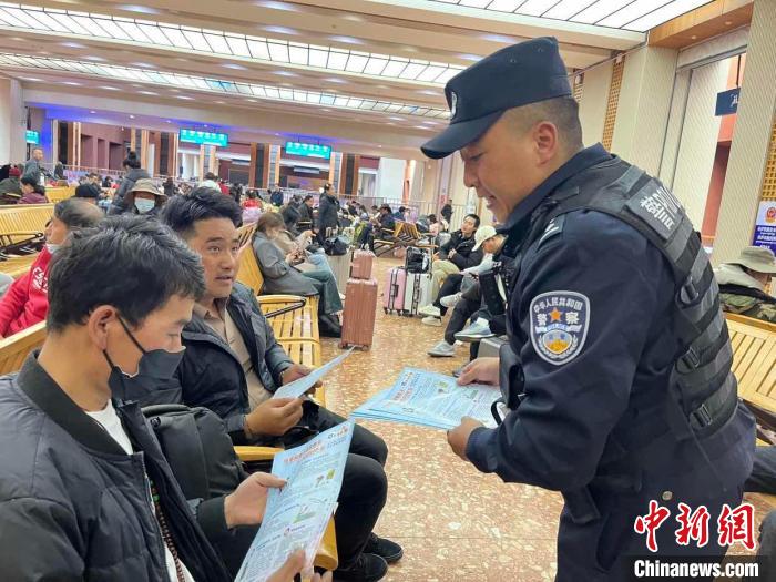 圖為拉薩鐵路公安民警為游客發(fā)放宣傳冊。 貢嘎來松 攝