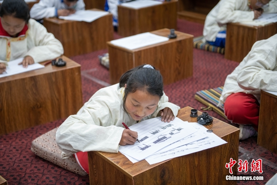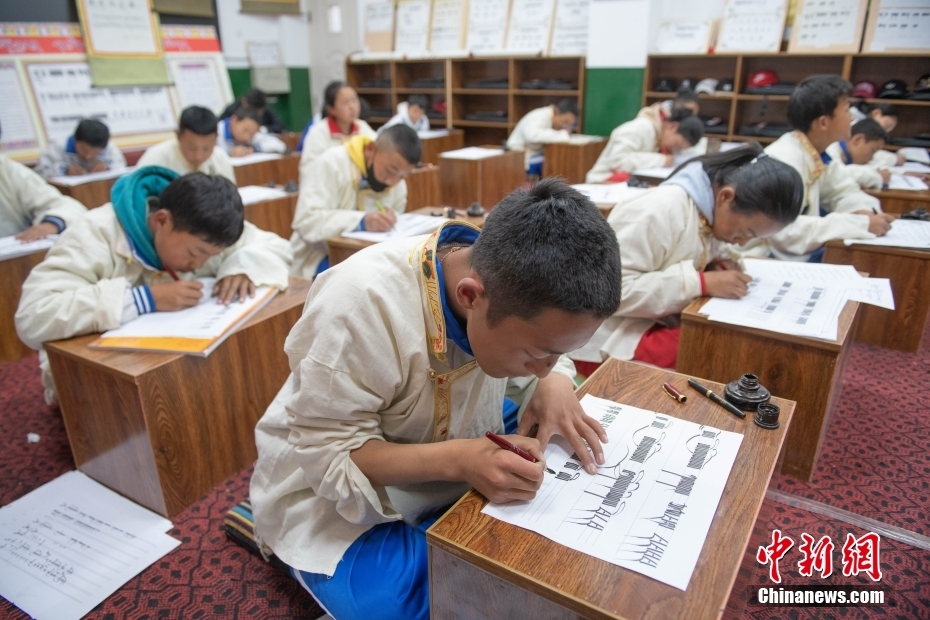 5月7日,西藏山南市,加查縣中學(xué)學(xué)生在上藏文書(shū)法興趣班。該興趣班由2名藏文教師任教,每周兩課時(shí),利用自習(xí)課或晚自習(xí)時(shí)間為學(xué)生和教師授課。課程內(nèi)容包含執(zhí)筆、運(yùn)筆、姿勢(shì)等基礎(chǔ)書(shū)寫(xiě)技能,以及藏文中的烏金體、珠擦體、簇仁體、簇通體等各類(lèi)字體的書(shū)寫(xiě)方法。