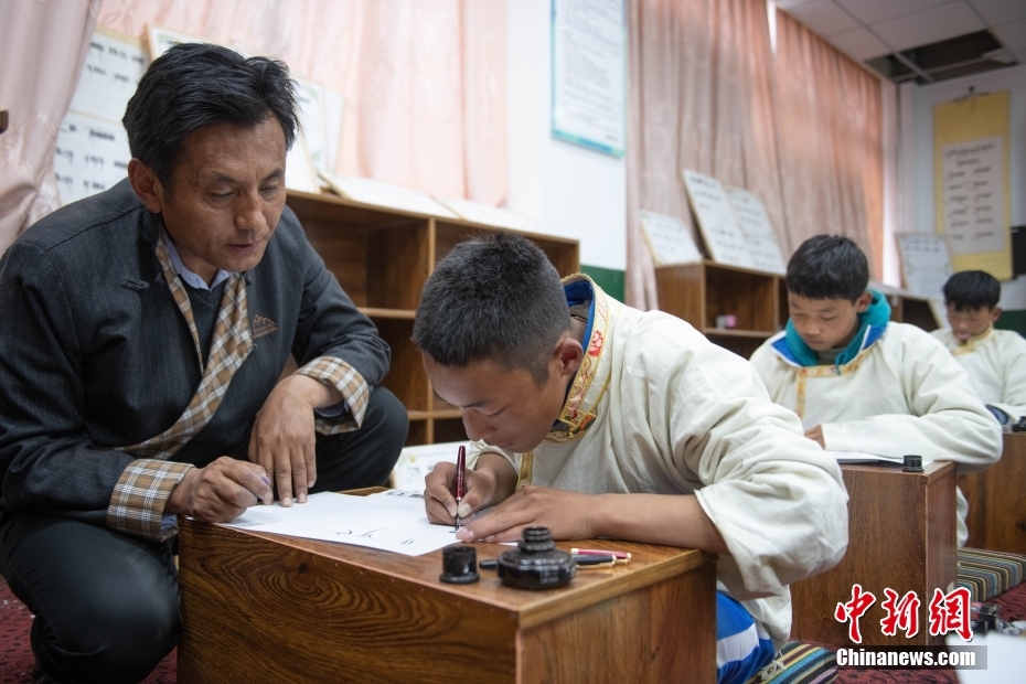 5月7日,西藏山南市,加查縣中學(xué)藏文書(shū)法興趣班的教師扎西達(dá)瓦(左一)對(duì)學(xué)生進(jìn)行指導(dǎo)。該興趣班由2名藏文教師任教,每周兩課時(shí),利用自習(xí)課或晚自習(xí)時(shí)間為學(xué)生和教師授課。課程內(nèi)容包含執(zhí)筆、運(yùn)筆、姿勢(shì)等基礎(chǔ)書(shū)寫(xiě)技能,以及藏文中的烏金體、珠擦體、簇仁體、簇通體等各類(lèi)字體的書(shū)寫(xiě)方法。