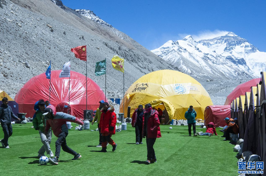 5月9日,登山隊員在珠峰大本營踢球。新華網(wǎng) 旦增努布 攝