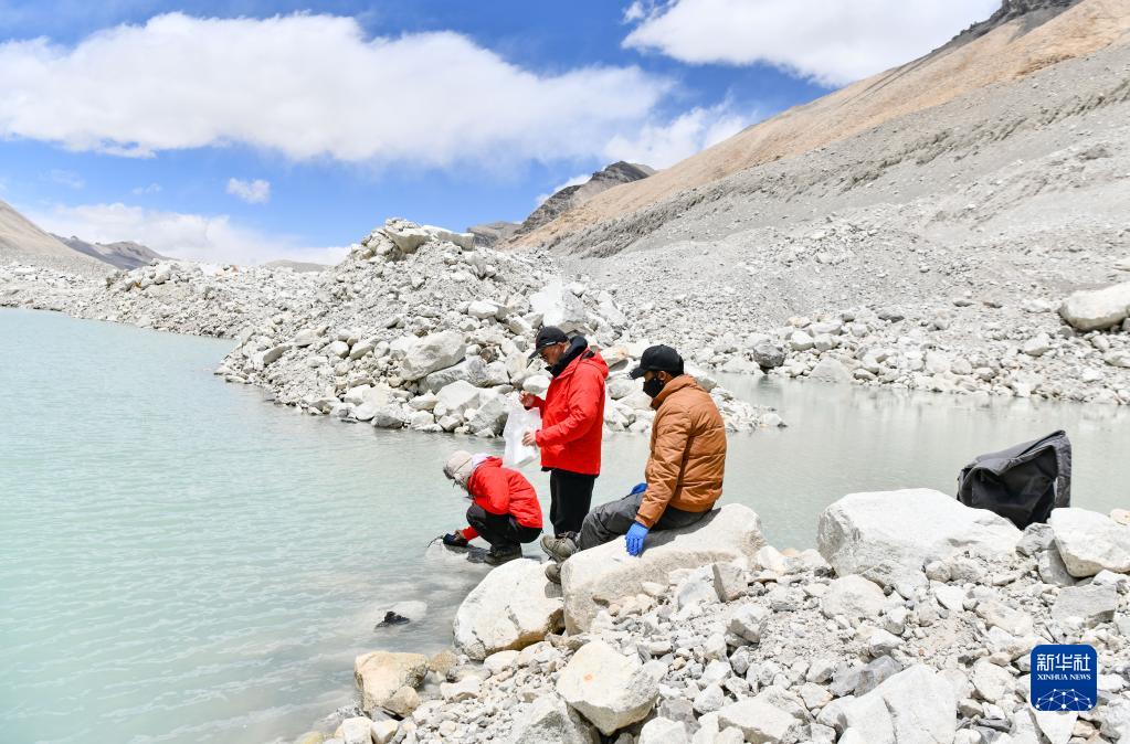 在珠峰登山大本營(yíng)附近,來自西藏大學(xué)生態(tài)環(huán)境學(xué)院的科考隊(duì)員在進(jìn)行水生態(tài)調(diào)查(5月22日攝)。新華社記者 孫非 攝