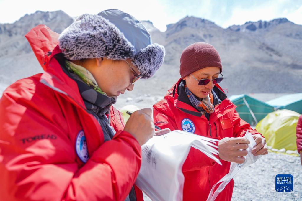 在珠峰登山大本營(yíng),中國科學(xué)院西雙版納熱帶植物園研究員蘇濤(右)和同事在樣品自封袋上做標(biāo)記(5月14日攝)。新華社記者 孫非 攝