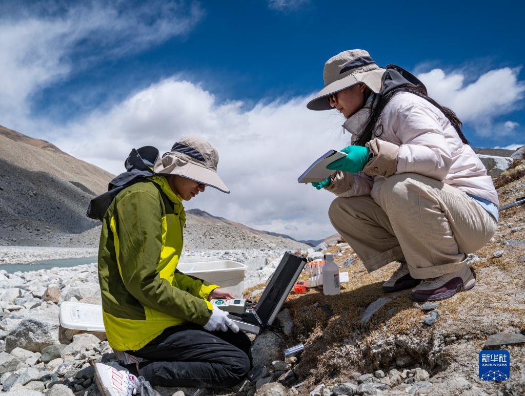在珠峰登山大本營(yíng)附近,來自西藏大學(xué)生態(tài)環(huán)境學(xué)院的科考隊(duì)員在測(cè)量土壤溫度(5月22日攝)。新華社記者 孫非 攝