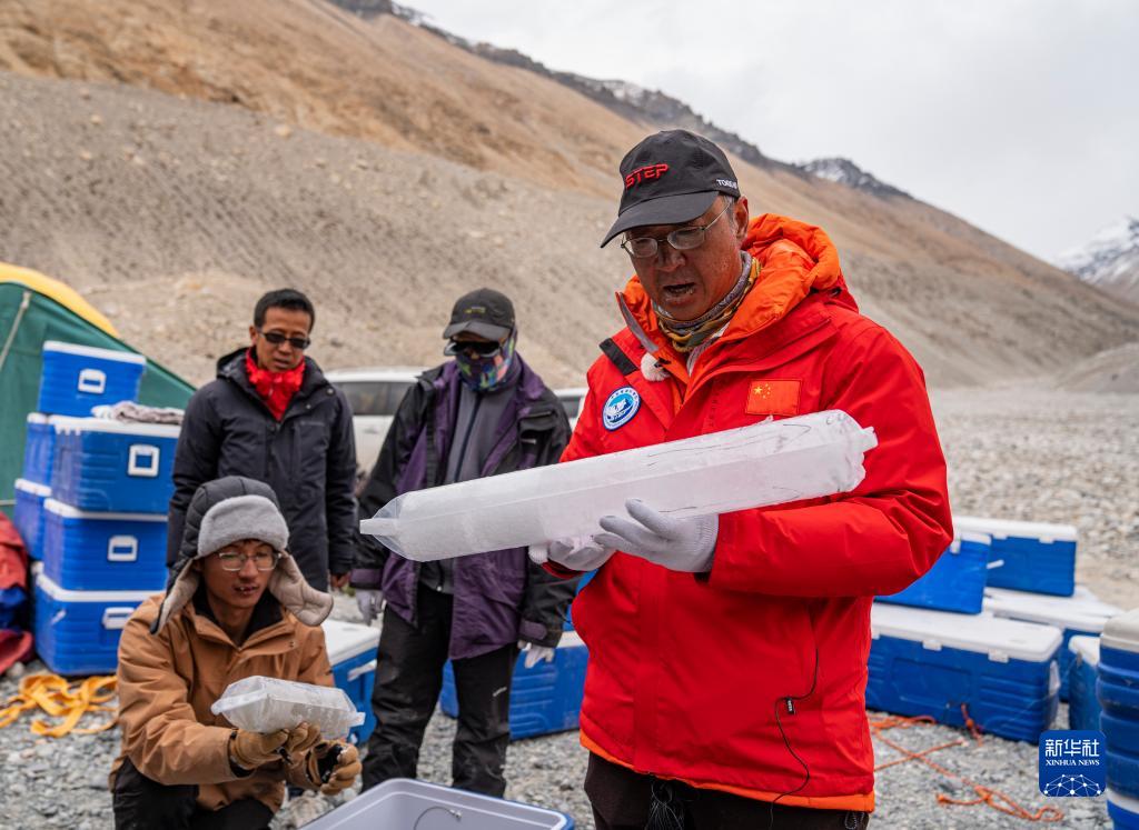 在珠峰登山大本營(yíng),中國科學(xué)院西北生態(tài)環(huán)境資源研究院副院長(zhǎng)康世昌(右)在查看從珠峰海拔約6500米處鉆取的冰芯樣品(5月22日攝)。新華社記者 孫非 攝