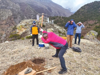 “大家開玩笑說(shuō),第一天基本上是搞基建。”樊晉表示,要架設(shè)自動(dòng)氣象站得先挖地基,“得把搭建儀器用的水泥、砂石搬運(yùn)到架設(shè)點(diǎn),有些基坑表層土壤下面巖石還比較多。剛開始缺乏經(jīng)驗(yàn),我們用木棒扛水泥袋,結(jié)果太重把木棒撐斷了,最后換上鋼管才解決問(wèn)題。挖好基坑后,還要等水泥凝固后,第二天再上山架設(shè)儀器?!?/p>