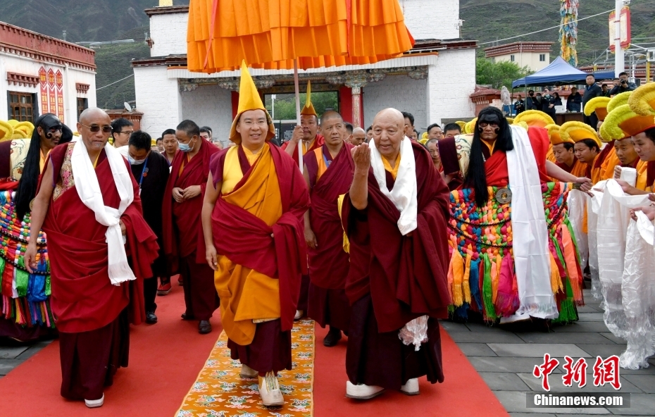 6月12日,全國政協(xié)常委、中國佛教協(xié)會副會長、中國佛協(xié)西藏分會會長班禪額爾德尼·確吉杰布在西藏昌都市強巴林寺禮佛講經(jīng),并為3.6萬余名信眾摸頂賜福。強巴林寺僧眾組成儀仗隊、焚香、吹響法號,高舉寶傘等,以藏傳佛教最高禮儀迎接班禪。強巴林寺為藏傳佛教格魯派創(chuàng)始人宗喀巴弟子向森·西繞桑布創(chuàng)建于15世紀(jì),因寺內(nèi)主供強巴(彌勒)佛而得名。圖為6月12日,班禪抵達(dá)西藏昌都市強巴林寺,僧眾組成儀仗隊、焚香、吹響法號,高舉寶傘等,以藏傳佛教最高禮儀迎接班禪。
