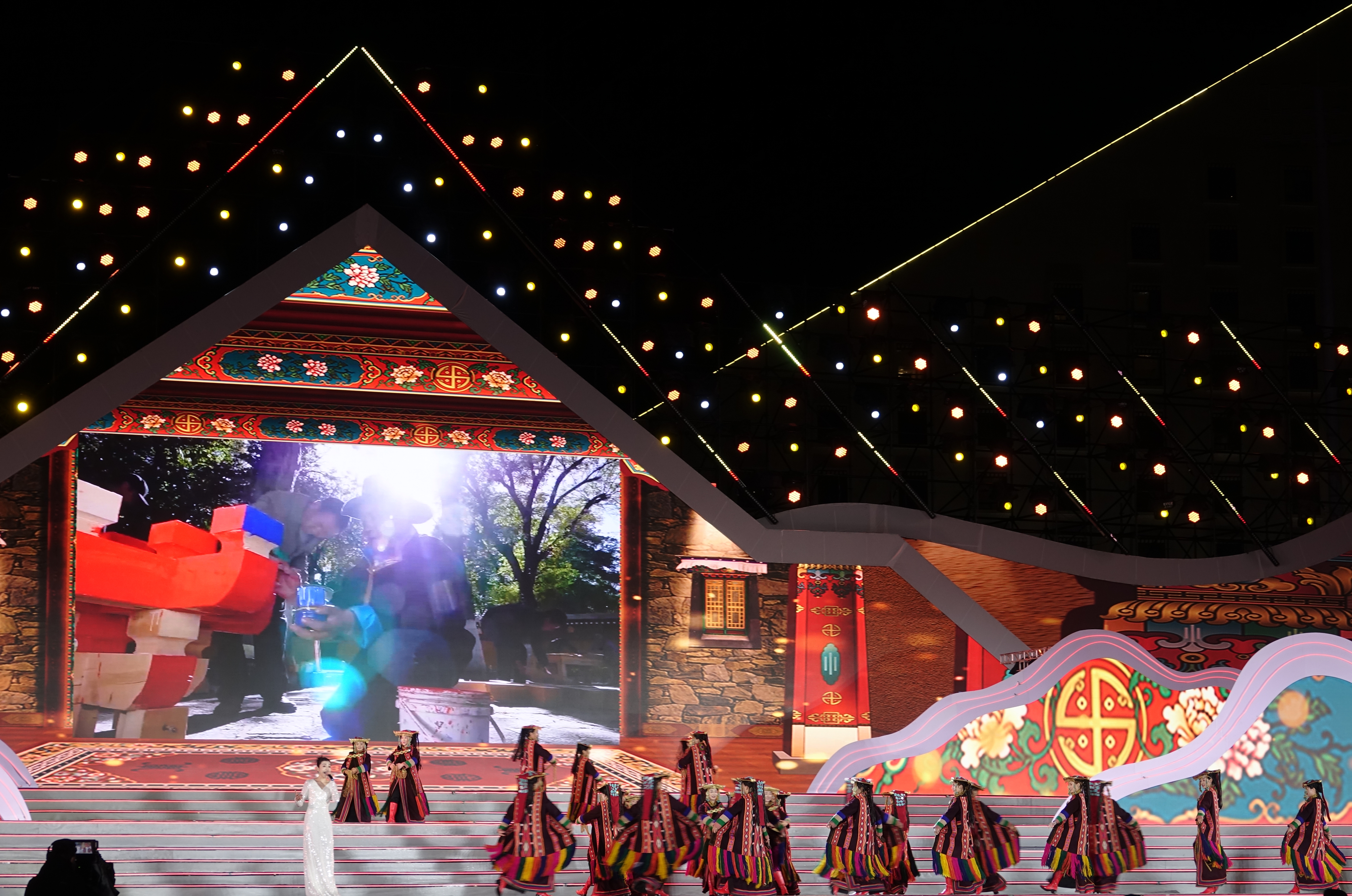 文藝演出《擁抱新西藏》在經(jīng)久不息的歡呼聲中開場。京劇《四郎探母》、藏戲《扎西雪巴》、粵劇《文成公主》選段,三種戲曲藝術(shù)跨界融合表演,充分展現(xiàn)了中華優(yōu)秀傳統(tǒng)文化的魅力,在文化的交融中飽含各族兒女對祖國母親的熱愛和眷戀之情。情景歌舞《我來了,西藏》《金色家園》《呀啦嗦》《幸福踏歌》等精彩節(jié)目,生動展現(xiàn)了新時代十年西藏各項事業(yè)取得的全方位進步、歷史性成就;《牽夢西藏》《心手相連》《云端上的納木措》《藍天下的祝?!贰稅傄麸w揚》《飲酒歌》,充分展示了西藏自然風(fēng)光之美、歷史人文之美、民族風(fēng)情之美、包容開放之美,再次向世界發(fā)出真誠邀約,歡迎四面八方的朋友親近西藏、感悟西藏。
