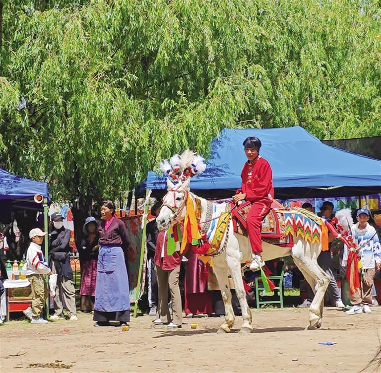 賽場上,幾個稚嫩的小伙子引起了大家的注意。他們熟練地跳上馬背、抓緊韁繩、目光堅定。“哇!太棒了!”“媽媽,那個哥哥拿到了哈達!”……只見16歲的單增阿旺策馬奔騰,俯身拾起地上的綠色哈達,獲得大家的陣陣掌聲?!拔覐男【秃芟矚g騎馬,除了去年因為學(xué)業(yè)緊張,沒能參加賽馬表演,往常每年都會參加?!眴卧霭⑼f。