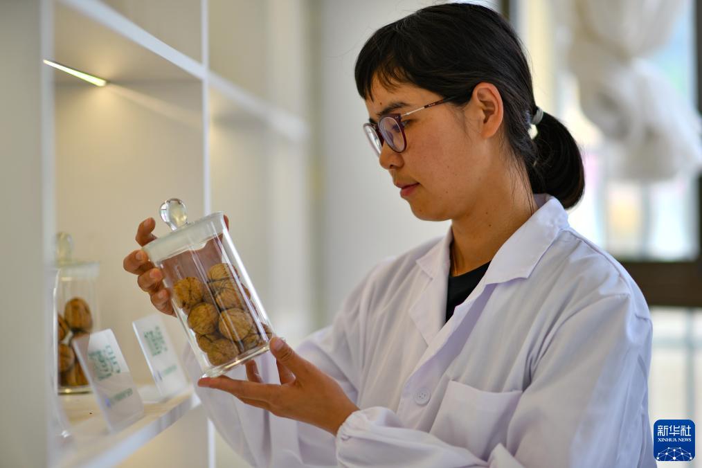 劉利平博士在高原核桃研究所檢查核桃果實標(biāo)本(7月27日攝)。新華社記者 旦增尼瑪曲珠 攝
