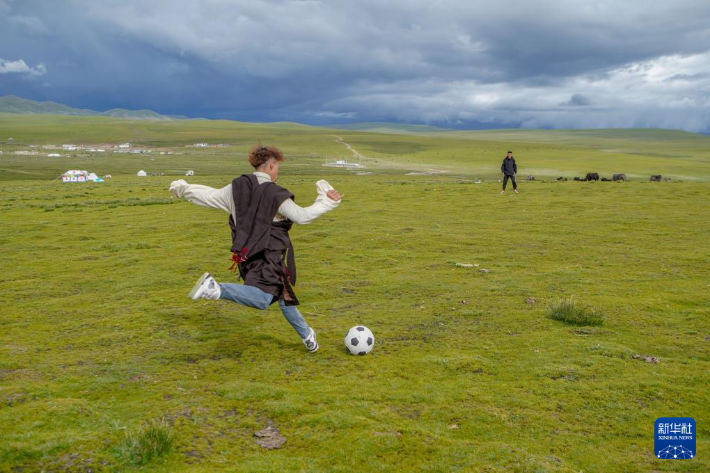 8月11日,旦增旺久和朋友在草原上踢足球。旦增旺久是次扎達兒子列熱覺旦的表哥,遠(yuǎn)在千里之外的湖南上學(xué),但還會經(jīng)常想起“隆達熱巴”。正值暑假,回到草原的他會細(xì)心地為“隆達熱巴”梳毛,跟它說悄悄話。新華社記者 邵澤東 攝