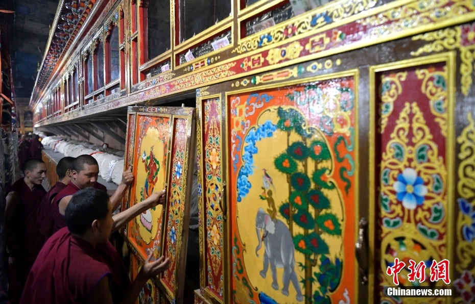 8月16日,拉薩哲蚌寺僧人在為展佛做準(zhǔn)備。