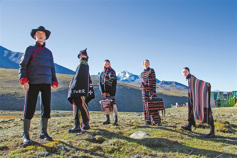 以萬(wàn)里晴空為幕,以乃欽康桑雪山為背景。隨著富有濃郁藏族風(fēng)情的銅鈴聲響起,模特們身著40套款式各異的創(chuàng)新氆氌工藝服飾,陸續(xù)登場(chǎng),為觀眾呈現(xiàn)了一場(chǎng)震撼心靈的視覺盛宴。