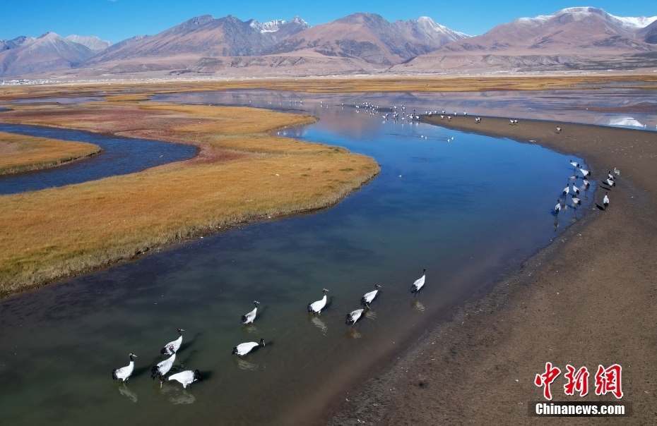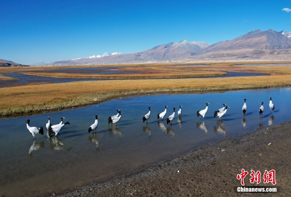 10月23日,成群的黑頸鶴在拉薩市當雄縣阿熱濕地內(nèi)覓食。黑頸鶴是全球十五種鶴類中,唯一在高原地區(qū)繁殖和越冬的鶴類,屬中國國家一級保護野生動物。
