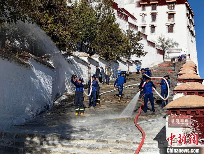 布達(dá)拉宮墻體粉刷正式開始前一周,大隊(duì)每日清晨、傍晚組織指戰(zhàn)員對(duì)布達(dá)拉宮山體進(jìn)行全面濕化,消除火災(zāi)隱患。劉瑜 攝