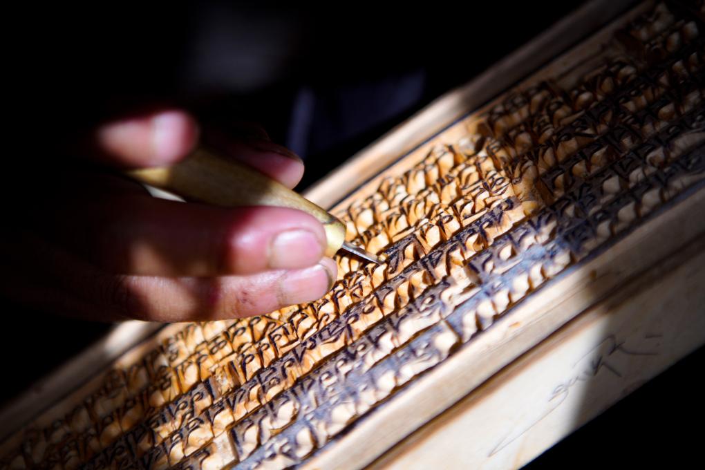 波羅刻版制作并不容易,包括切割、曬油、加固等十多道工序。澤培說:“我們一般選用優(yōu)質(zhì)的紅樺樹,必須要耐磨、沒有裂縫。正式刻制時(shí),每一個(gè)字都必須與模板相對(duì)應(yīng),不能跑偏、變形。要想雕刻好,需要熟練掌握藏文書法等相關(guān)知識(shí)。一個(gè)字刻壞了,整個(gè)作品就毀了?!?/p>
