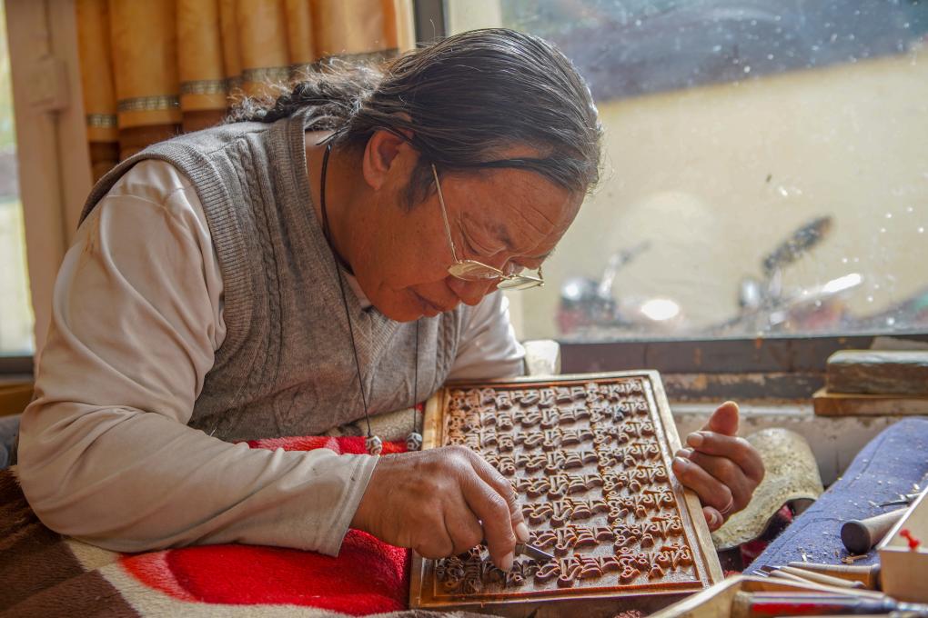 一手緊握刻刀,一手托住木板,刀起刀落間,木屑剝落,一件件樣式精美、色澤瑩潤(rùn)的雕刻成品躍然眼前。在西藏昌都市江達(dá)縣波羅鄉(xiāng)外沖村,“波羅古澤刻版制作技藝”國(guó)家級(jí)傳承人澤培正在認(rèn)真指導(dǎo)學(xué)徒制作木刻。