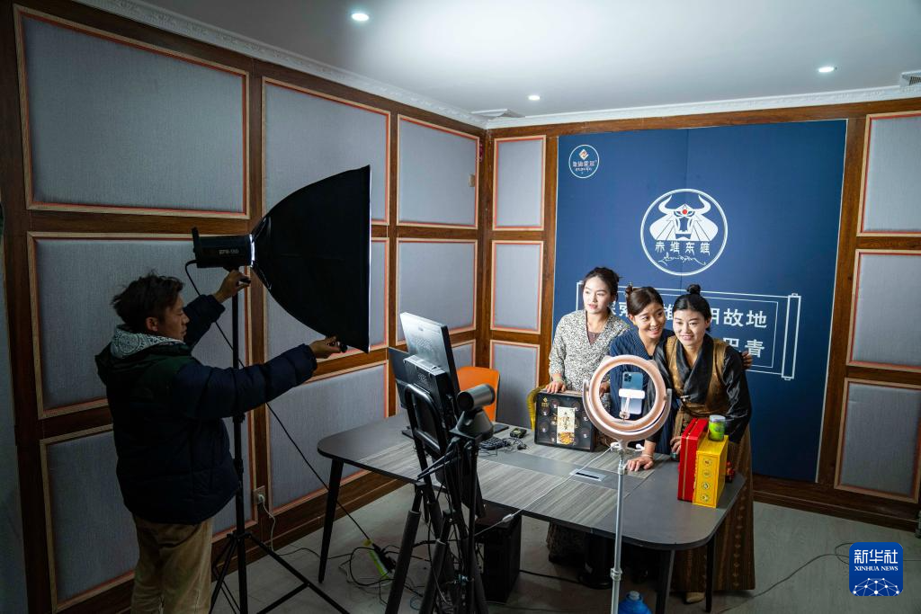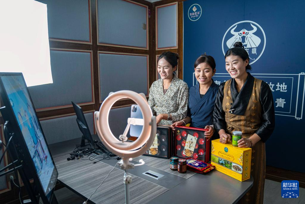 網絡主播在巴青縣“赤堆東雄”網紅直播間推介當地特色農牧產品(10月29日攝)。新華社記者 孫非 攝