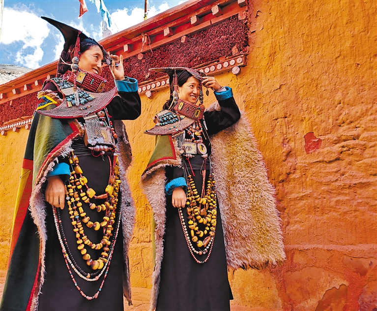 一大早,19歲的少女巴桑倉決和表姐巴桑普赤就開始整理各自傳承的“飛天服”。她們打開箱子,拿出精致的衣袍、披風(fēng)和綴滿珠寶的頭飾、項鏈,鄭重地穿戴在身上。當(dāng)整套“飛天服”呈現(xiàn)在眾人眼前時,大家無不為之驚嘆。