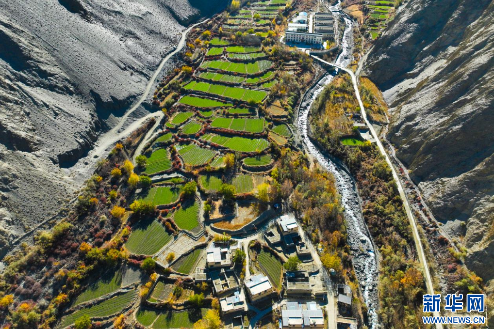 11月16日,西藏隆子縣加玉鄉(xiāng)境內(nèi)拍攝的村莊與農(nóng)田(無人機(jī)照片)。新華網(wǎng) 柑丹鴦琦 攝