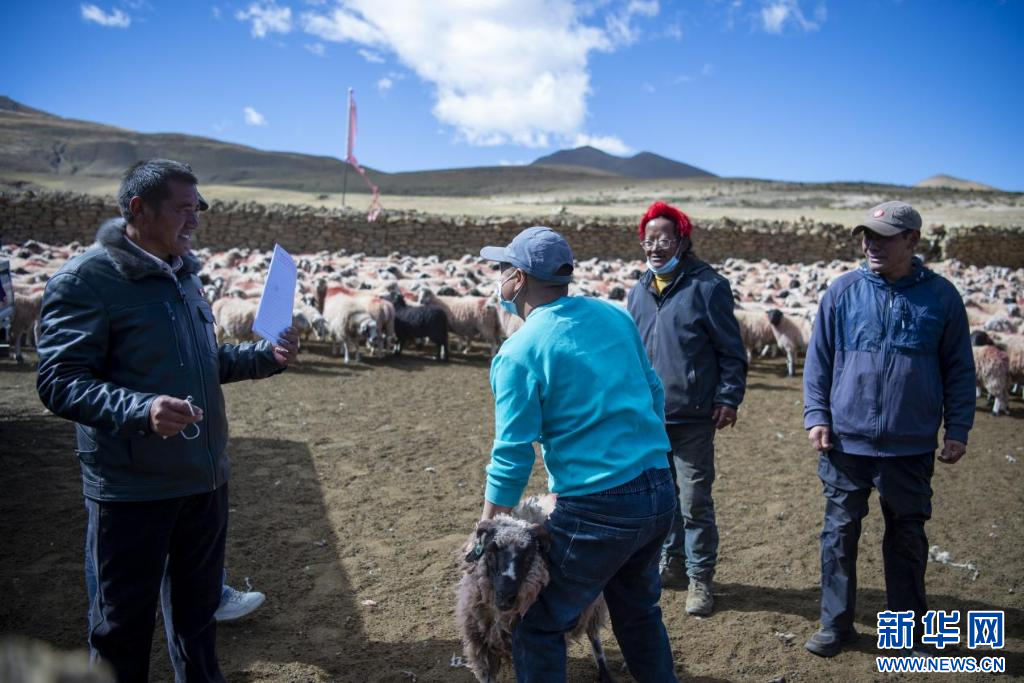 扎西松多村黨支部工作人員與商戶交易。新華網(wǎng) 旦增努布 攝